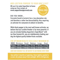 Curcumin found in turmeric has a low absorption rate and therefore a rather low bioavailability, thus requiring an activator for consumers to obtain its benefits. While black pepper is the most well known activator, we believe that our Lecithin Powder is far more powerful. If you are already feeding Augustine’s SuperBoost® with Raw Coconut Oil, you are indeliberately feeding your dog the highest quality Golden Paste available.