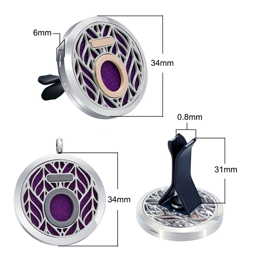 These 34mm stainless steel essential oil car clip diffusers are a great way to freshen up your car interior smell....naturally. The locket houses a small felt pad that you add a few drops of your favourite essential oil to before clipping to a car vent. The perferated rear side of the locket allows for the air to flow through and disperse the oil scent.